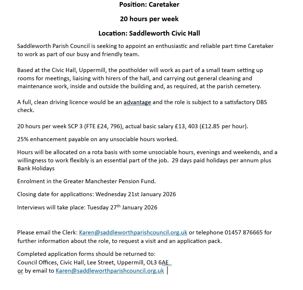 Business Job Vacancy – Saddleworth Parish Council Caretaker Gemma Carter December 22, 2025 job vacancy newsSaddleworth Parish Council Share this story:Tweet Email a link to a friend (Opens in new window) Email Print (Opens in new window) Print Related