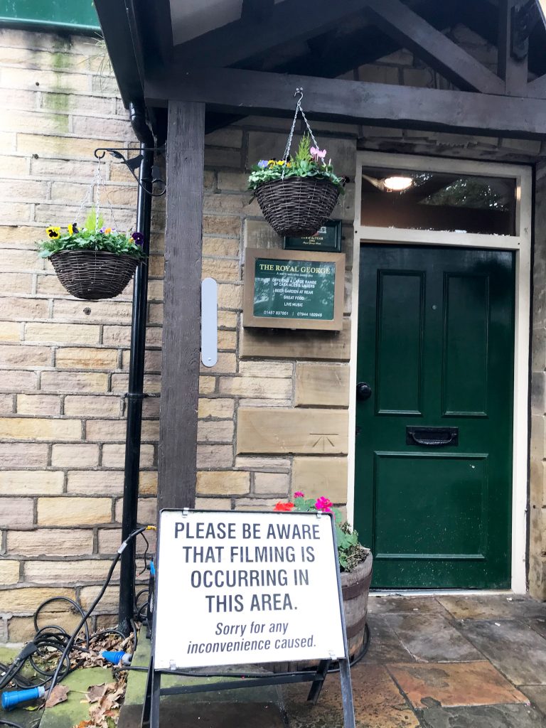 There were lights set up outside the pub, as well as notices reading: “Please be aware that filming is occurring in this area. Sorry for any inconvenience.”
